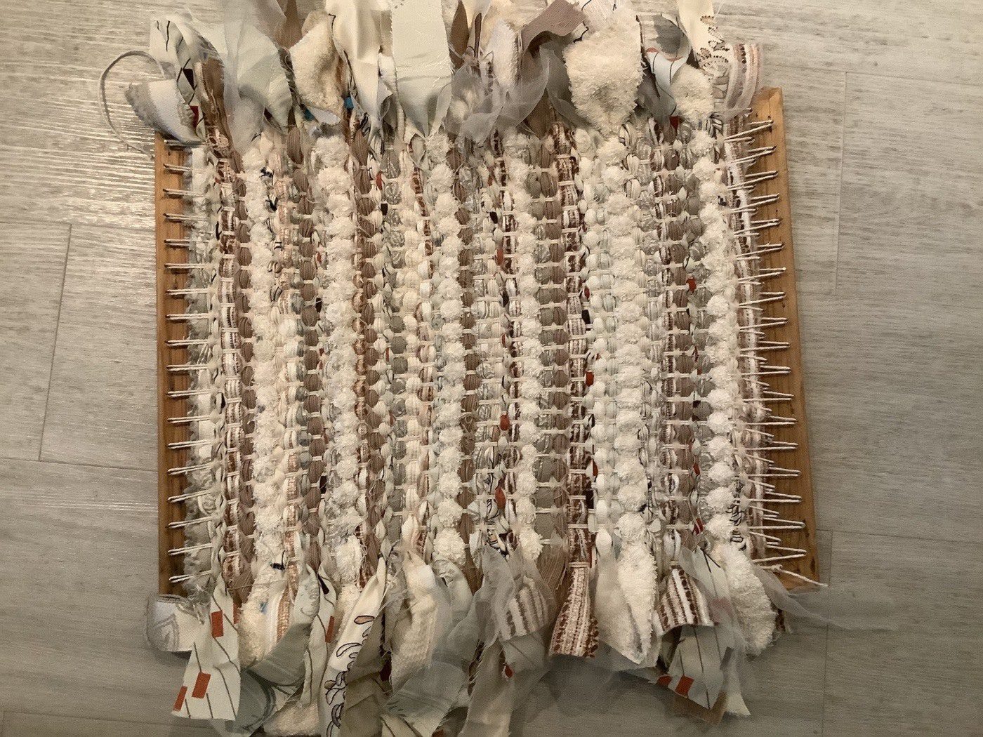 Here is some of the recent textiles work made through weaving on very old frames provided once again on a “mercy drop” by the Art department.
