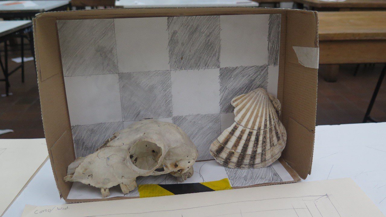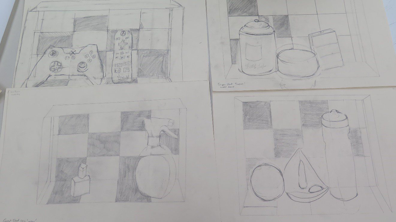 Then the pupils were asked to bring in objects from home and we set up each student with their own stage or still life set up so that social distancing could occur but that the same accuracy and rigour could be maintained from previous years. We put a grid into their box or stage so that the drawing could be more accurately plotted. It has been hard only being able to “correct” drawings after the pupils have left the studio but the results so far look as strong and as impressive as ever and although it is early days the drawing already look as good if not better than previous years.