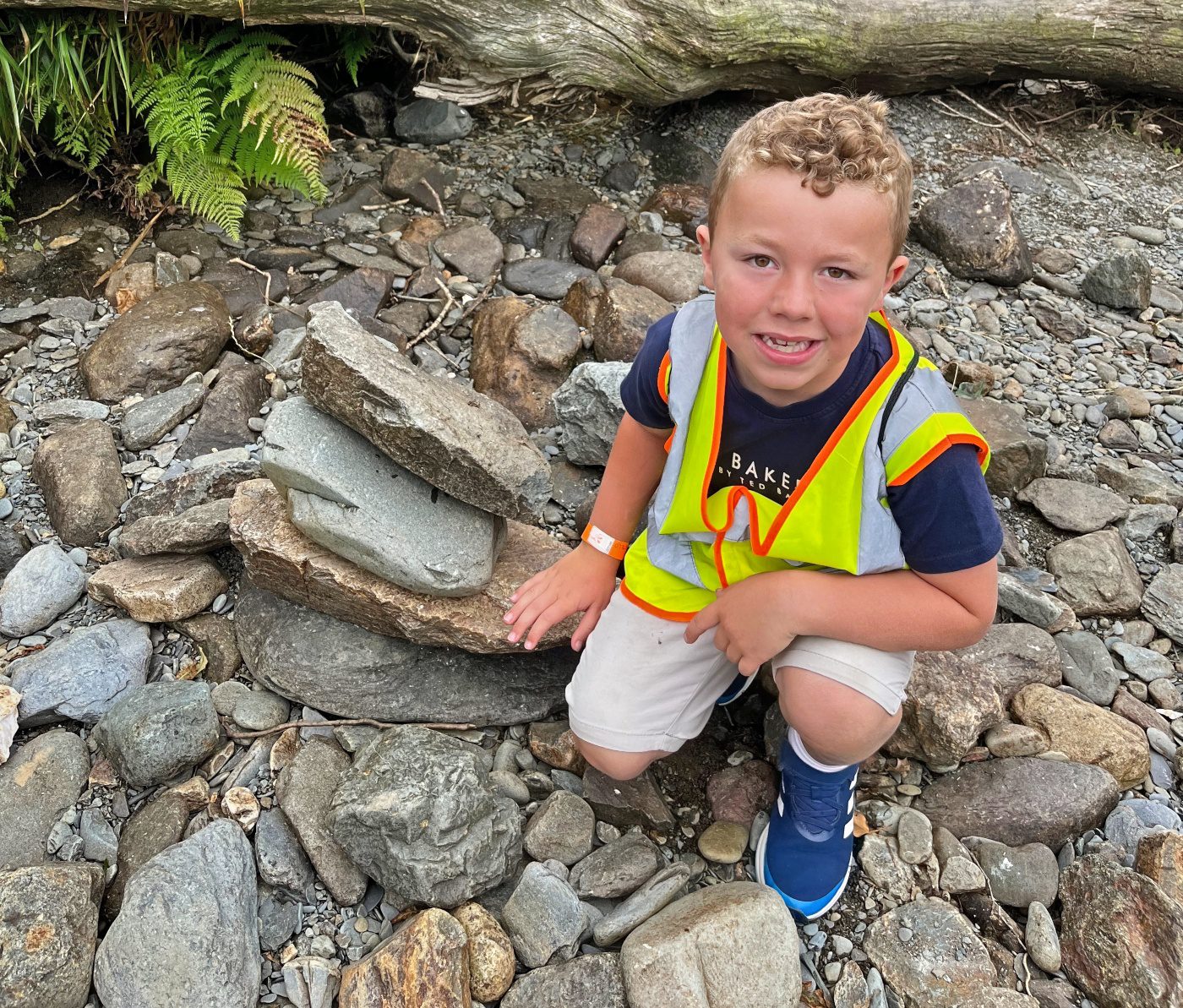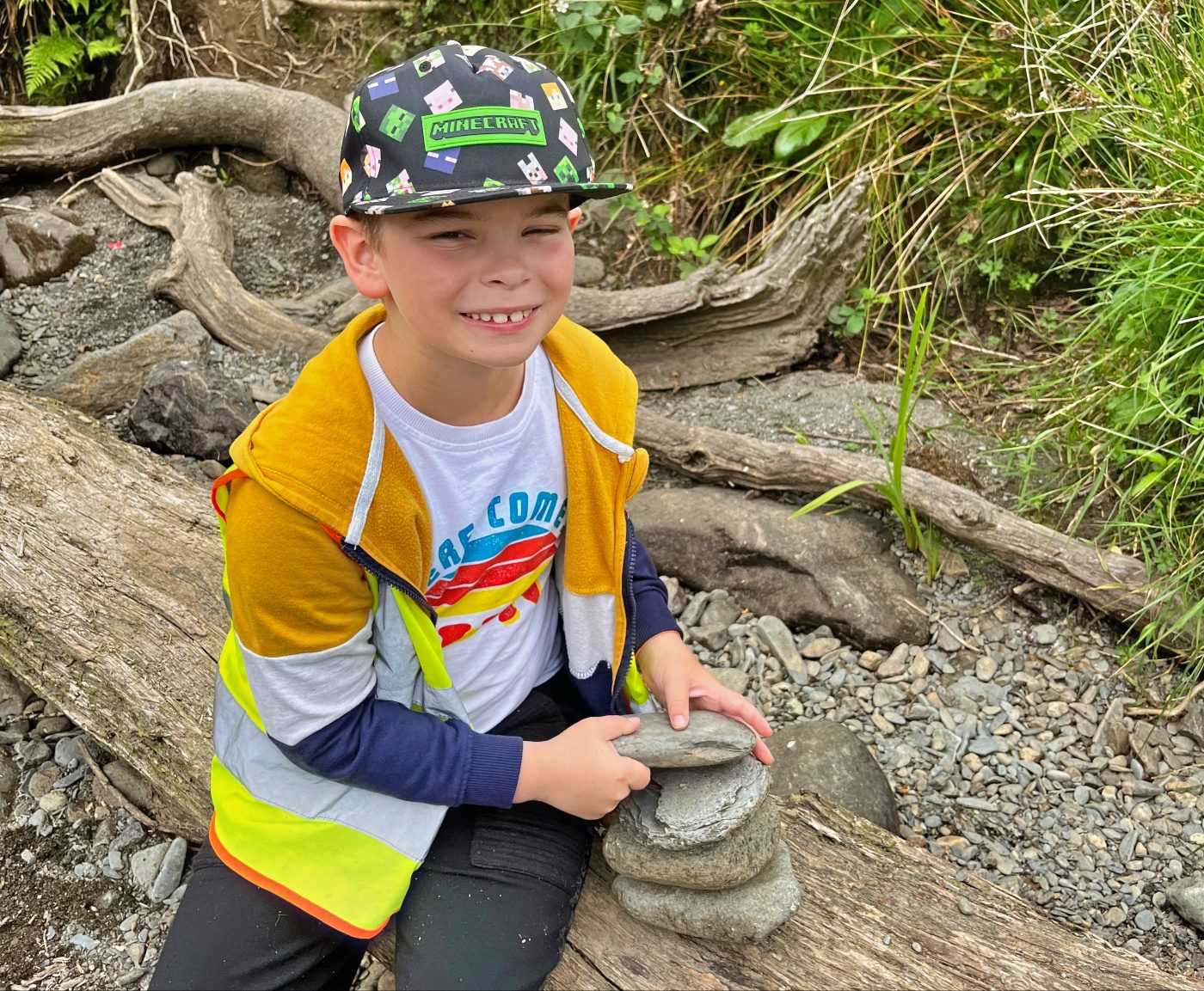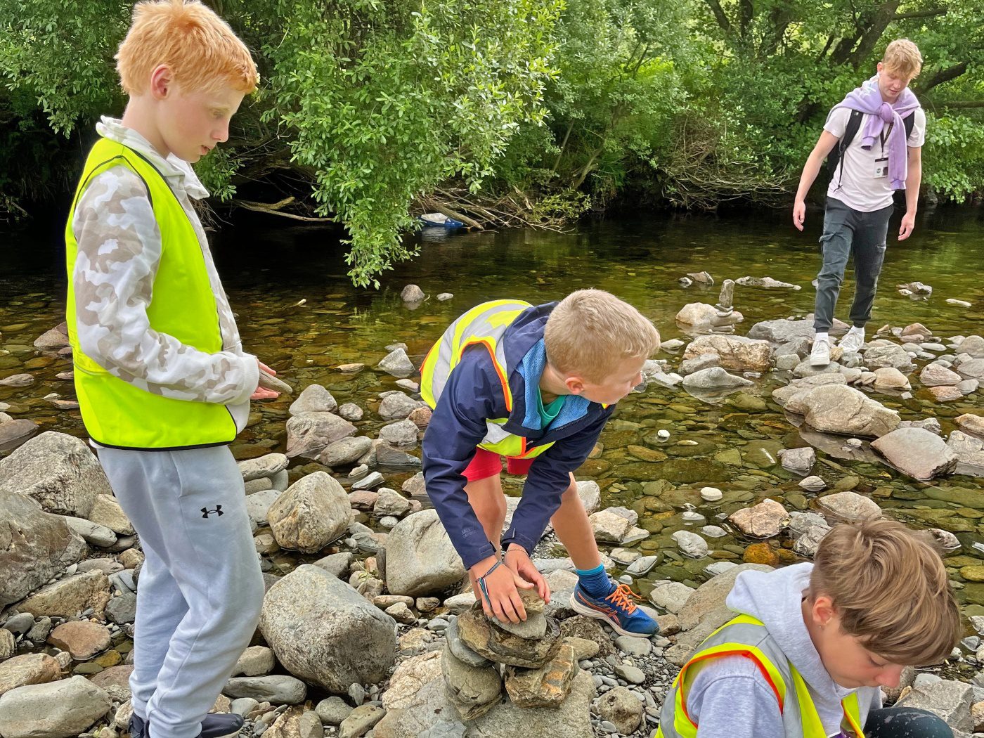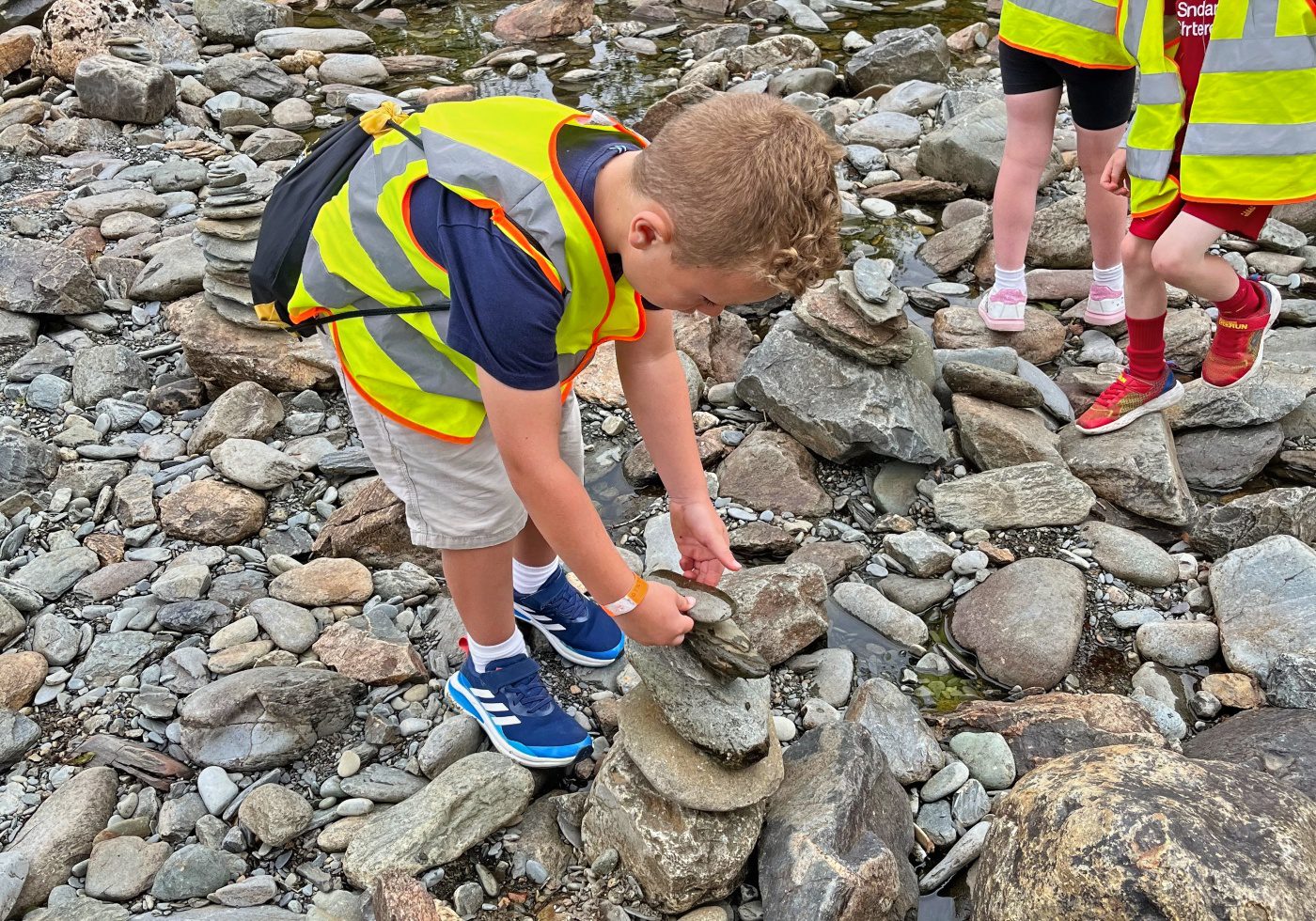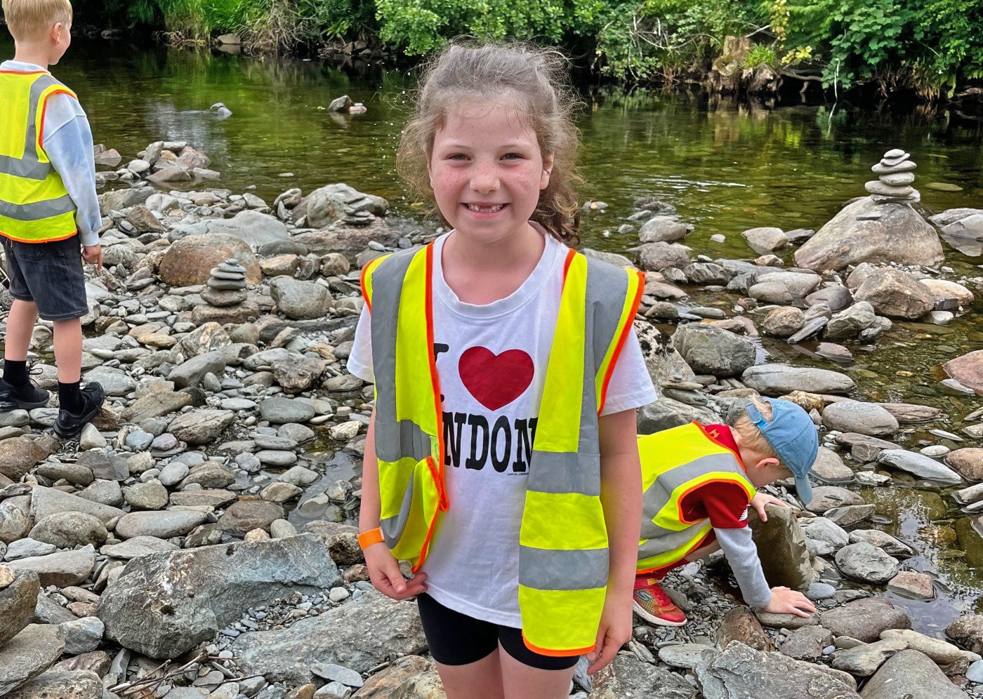 They walked across the footbridge and threw sticks into the river below to see which would get to the other side the quickest. As the group were walking back to the minibus, they noticed stacks of stones along the side of the riverbank.