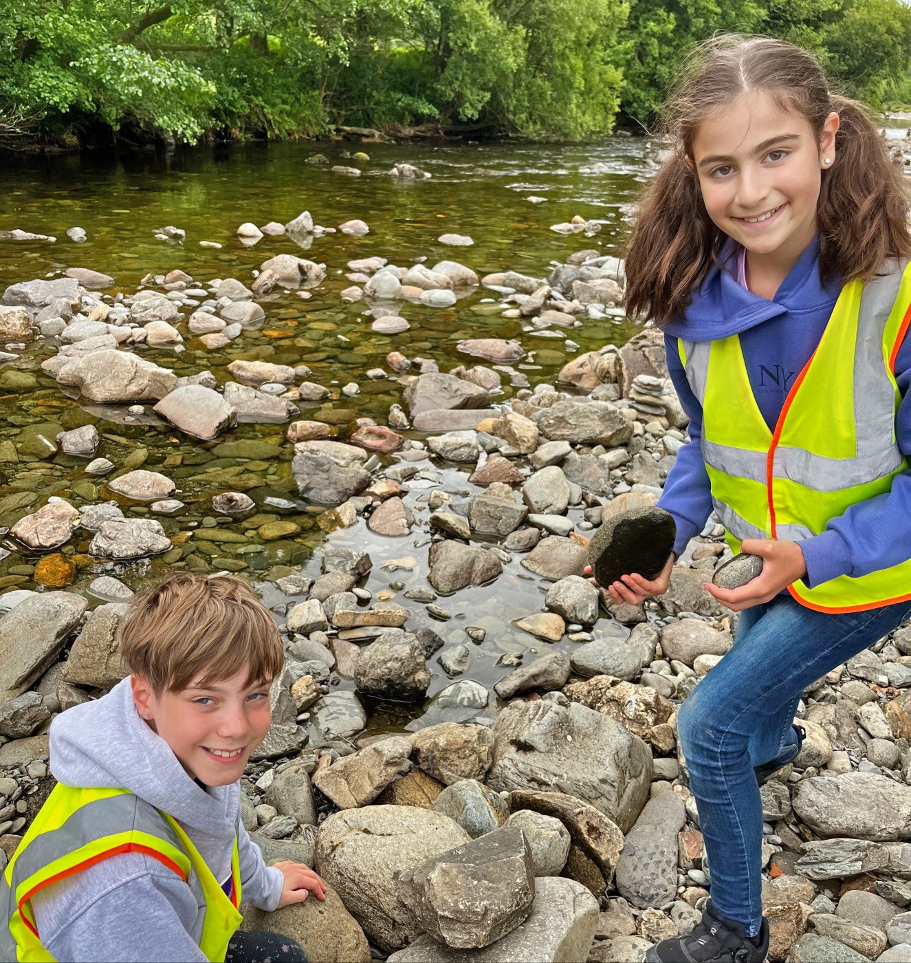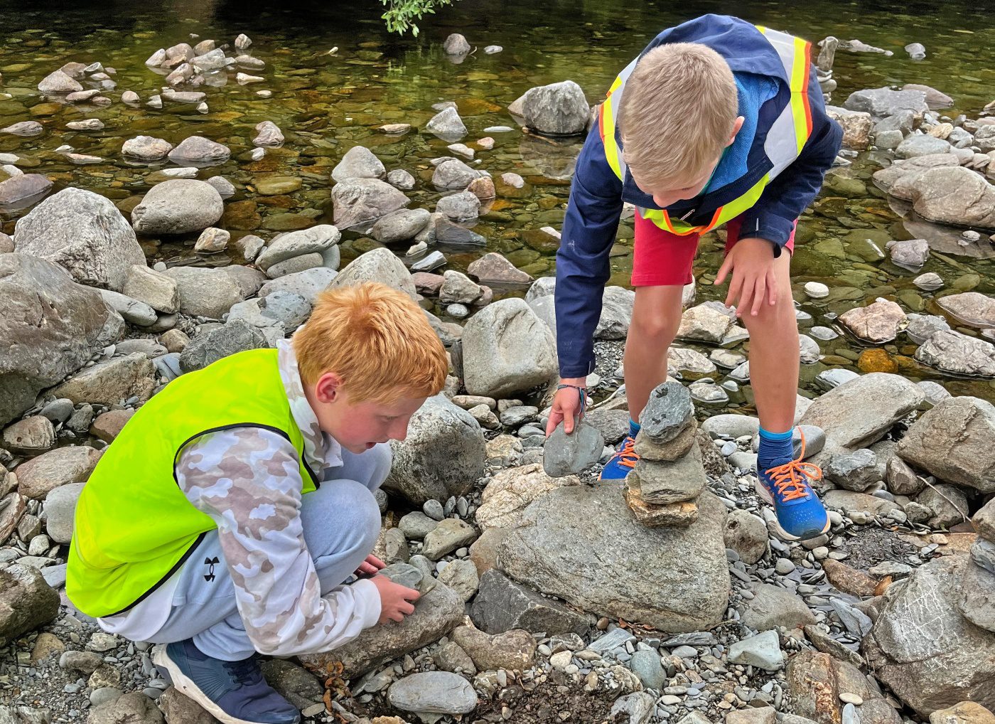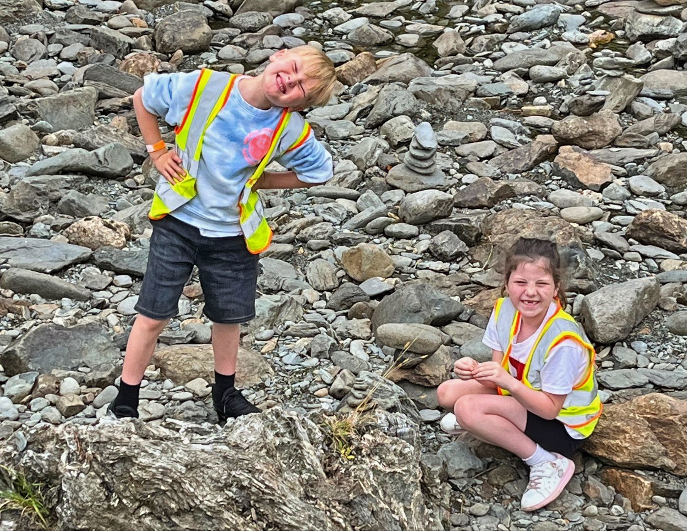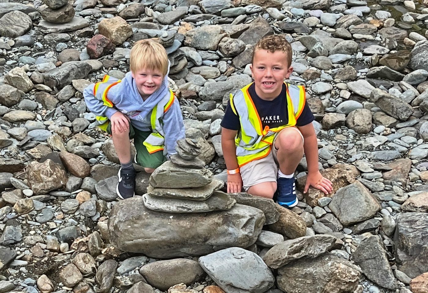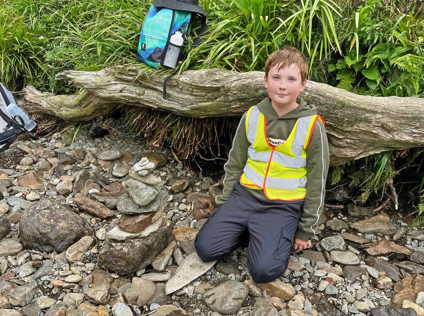 They walked across the footbridge and threw sticks into the river below to see which would get to the other side the quickest. As the group were walking back to the minibus, they noticed stacks of stones along the side of the riverbank.