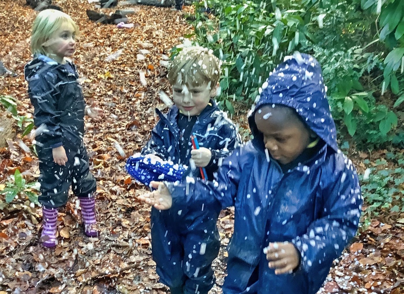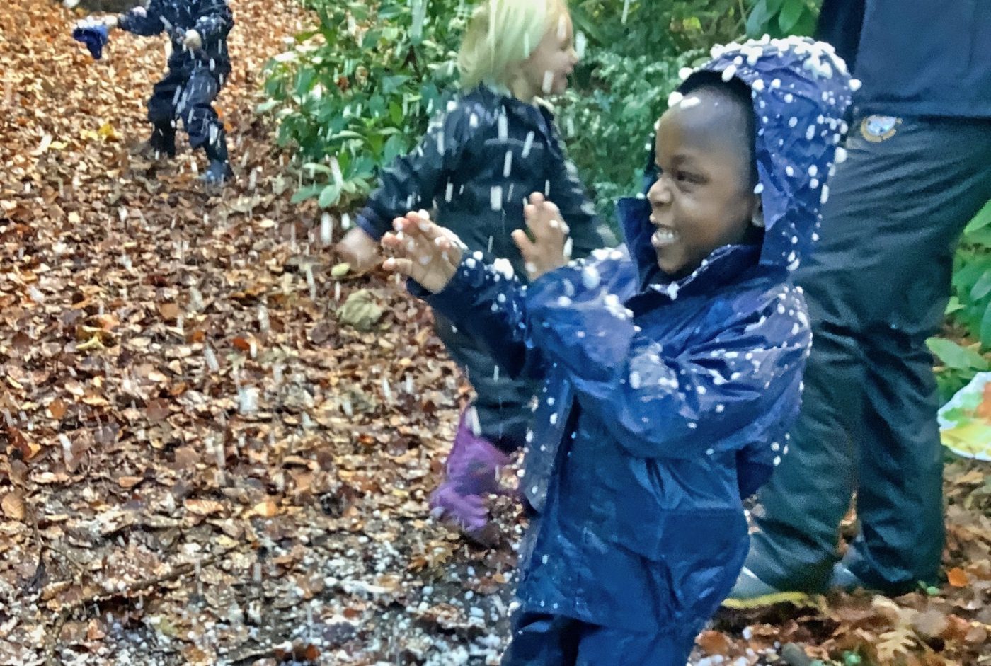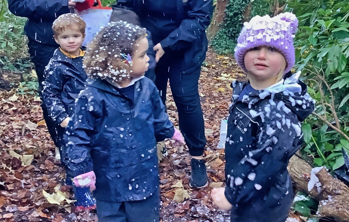 They are so fortunate to be able to have regular forest or coastal sessions during their early development, but this time was extra special. Upon arriving at the Forest School, snow descended to make it even more special!