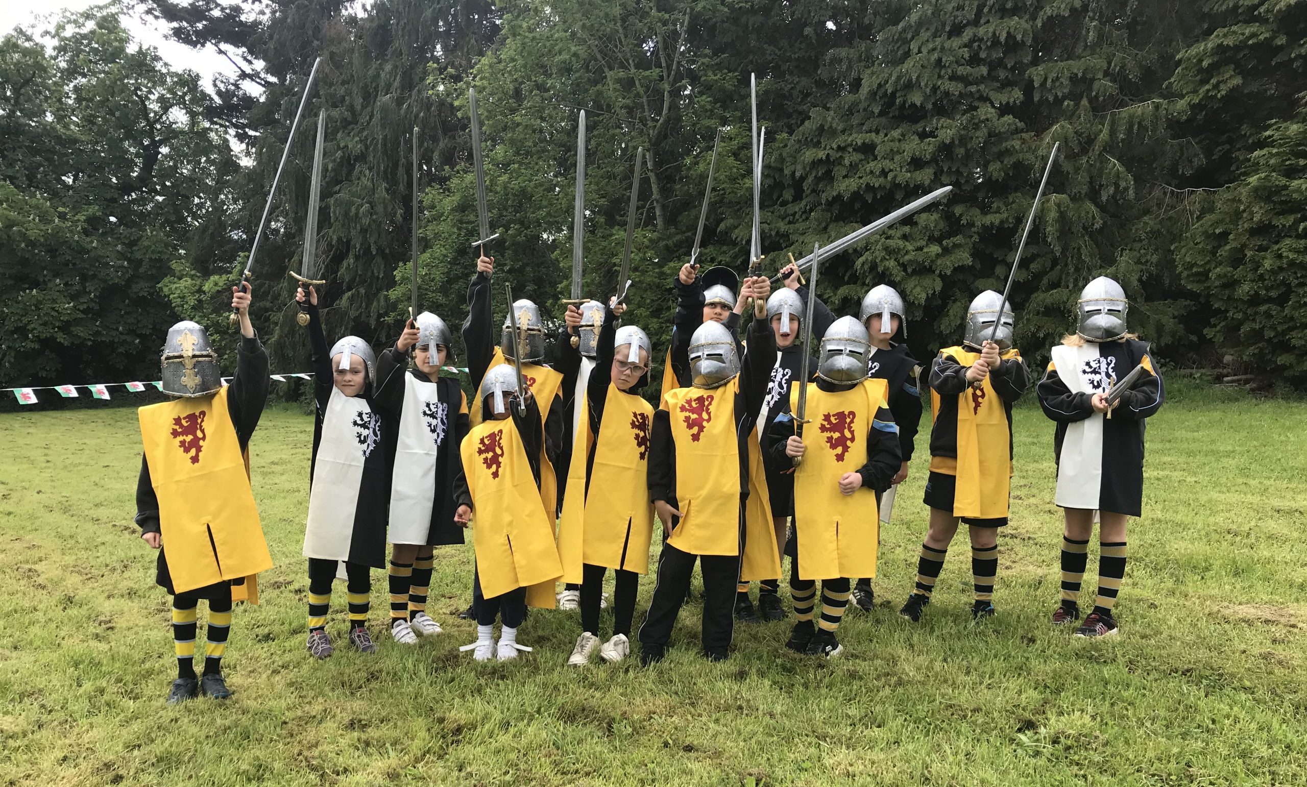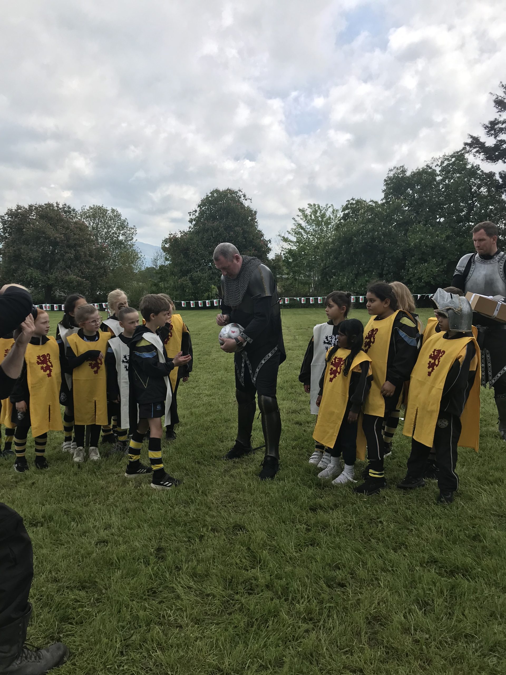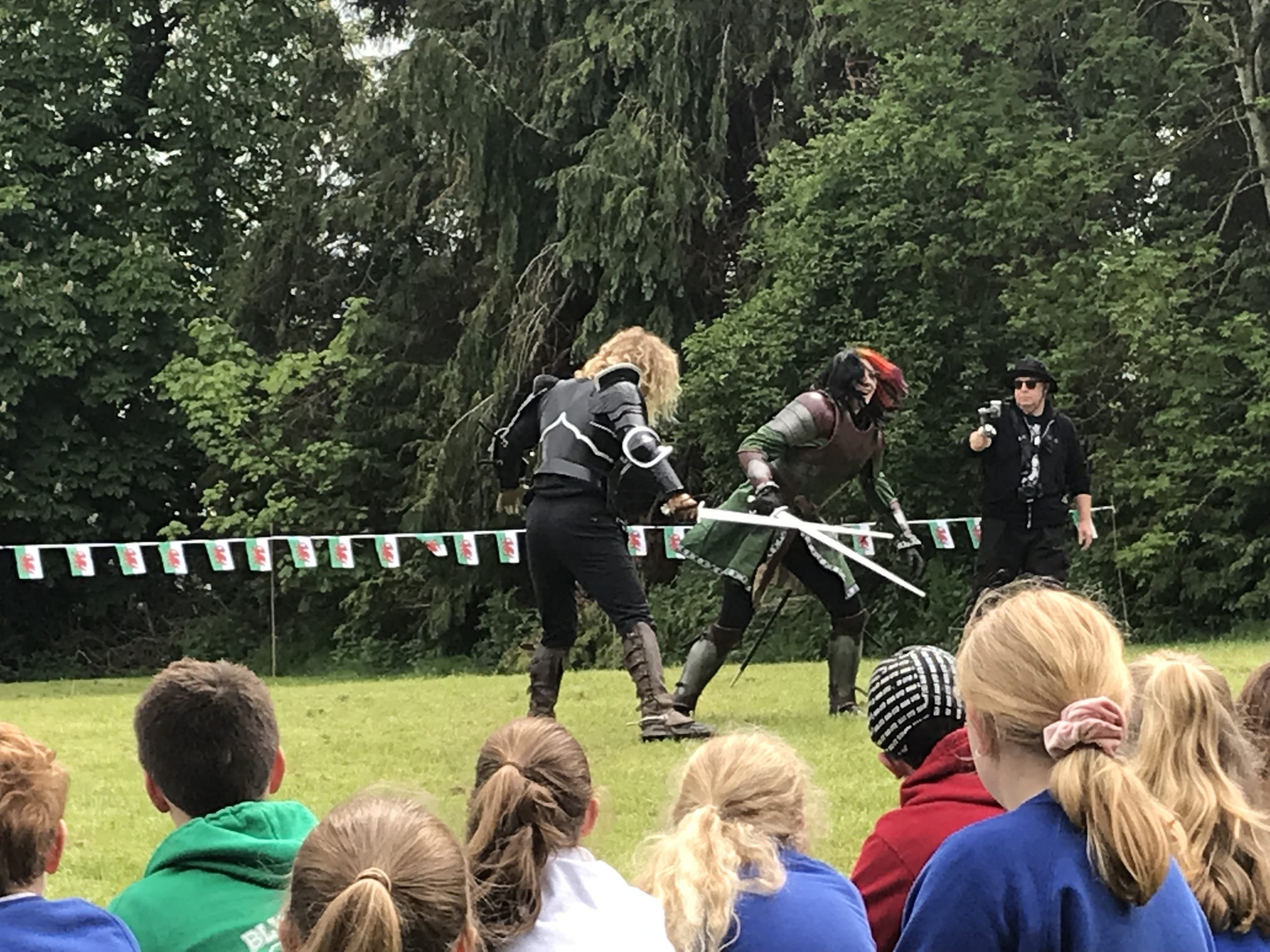 Passers-by couldn’t help but be captivated by the sight of the medieval knights making their way along the country lanes. On their return, the pupils were entertained by the Conwy Jester, whose impressive tricks left the young audience in awe. The highlight of the day came when two adult knights engaged in a thrilling sword fight, showcasing their skill to our captivated audience of pupils.